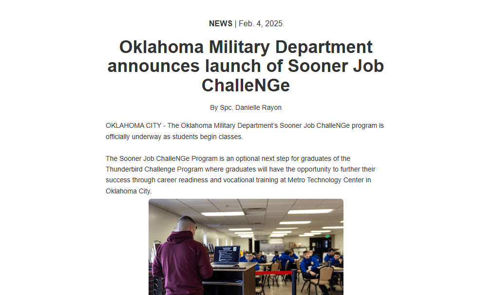 Oklahoma Military Department announces launch of Sooner Job ChalleNGe